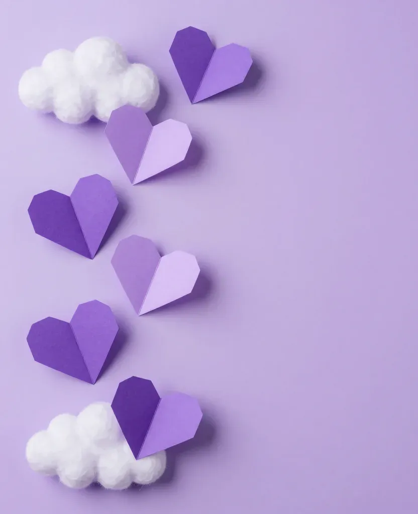 Glossy paper hearts and soft cotton clouds scattered against a diffused, soft light lavender background. The asymmetrical composition and gentle shadows create a calming and romantic atmosphere.