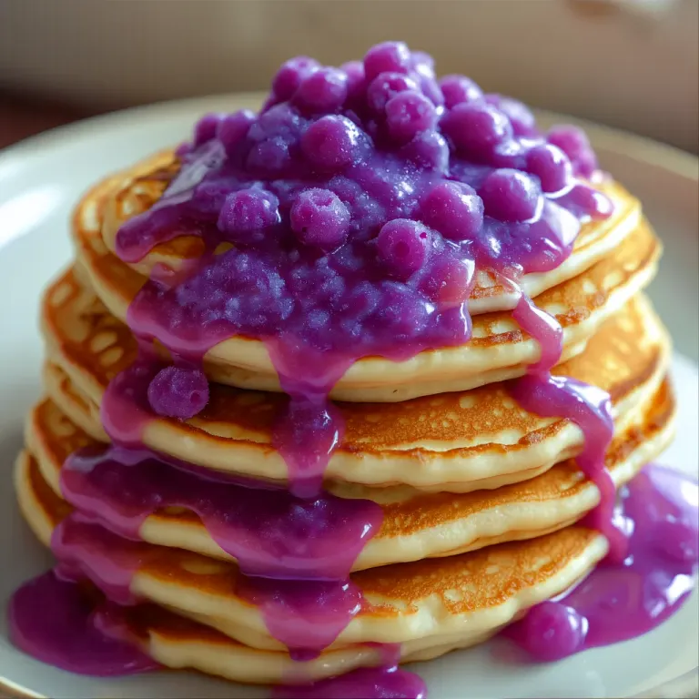 A stack of golden pancakes is topped with glossy, plump purple blueberries and a thick, glossy sauce, creating a visually striking crown. The soft, diffused lighting highlights the texture and layers, while the blurred background keeps the focus on the subject.
