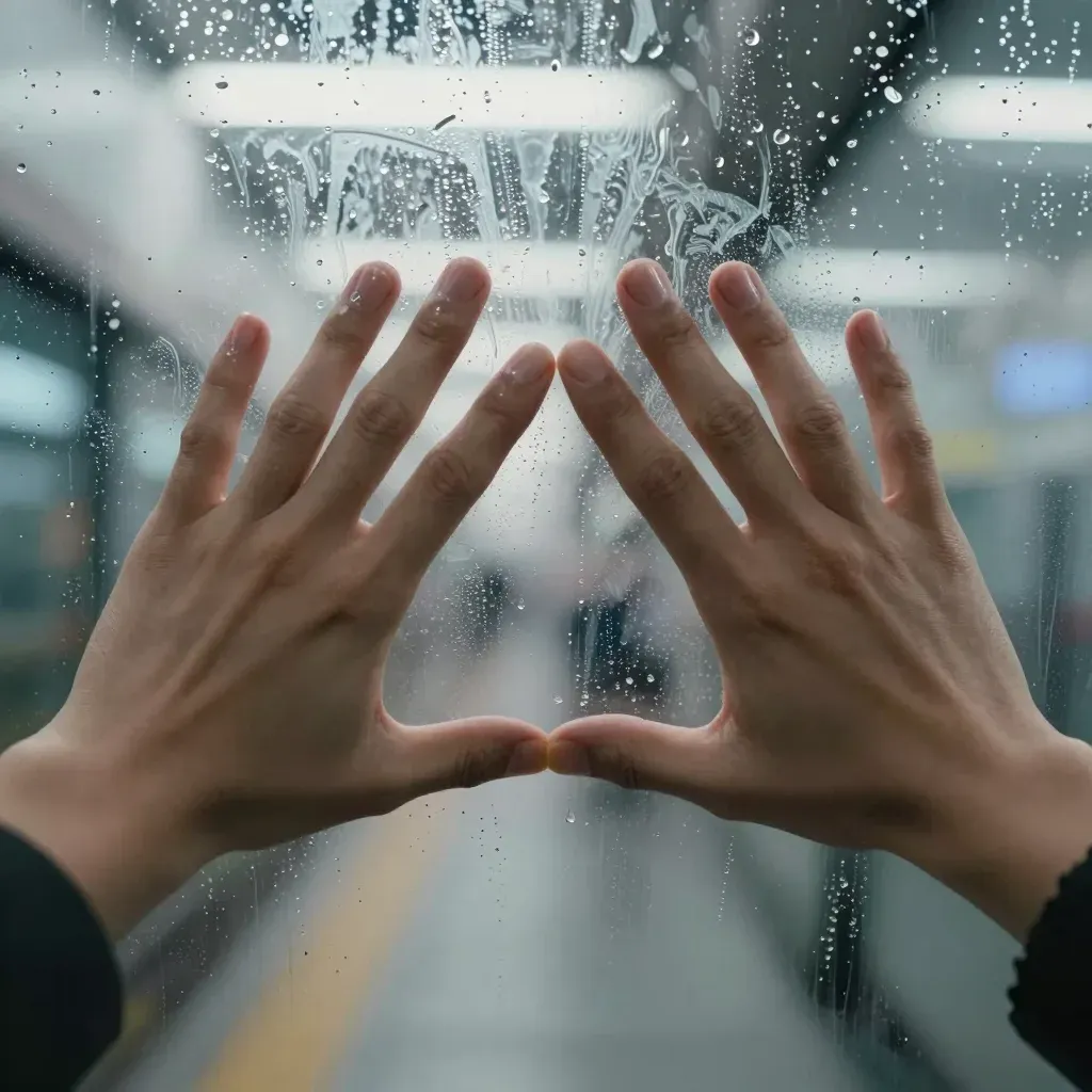 Two hands form a heart shape against a misted glass, creating a tender and intimate visual. The soft, diffused light enhances the gentle glow, while the blurred subway background adds depth and context.