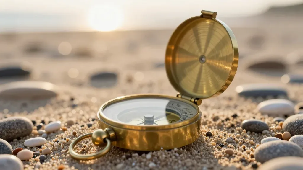A polished brass nautical compass with a glass dome rests open on fine sand, surrounded by smooth stones, catching warm golden hour light that highlights its reflective surface and creates soft rim lighting. The shallow depth of field isolates the compass in sharp focus against a blurred beach shoreline with bokeh from the distant sun, providing a clean background with natural leading lines.