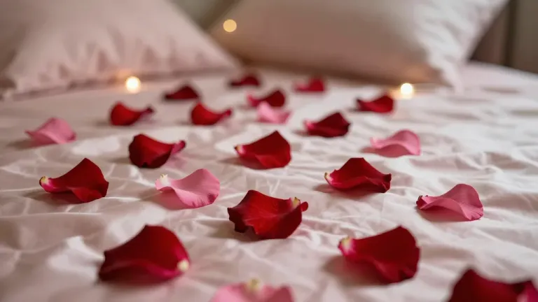 Glossy rose petals scattered on a soft, smooth satin bedspread, illuminated by warm ambient light that highlights their texture and color, creating a cozy and intimate atmosphere. The shallow depth of field focuses on the petals, leaving the background blurred for a clean, elegant look.