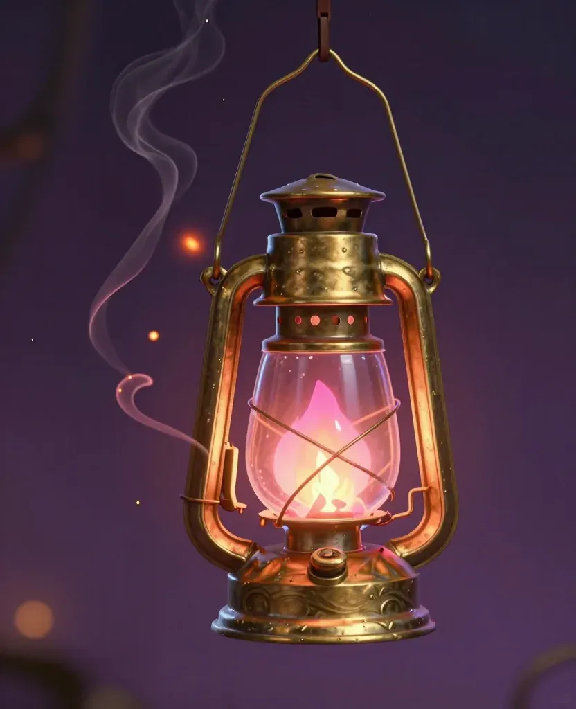A vintage brass lantern with a flickering flame inside, casting a warm glow against a twilight sky. The soft lighting and gentle smoke add a serene, nostalgic atmosphere.