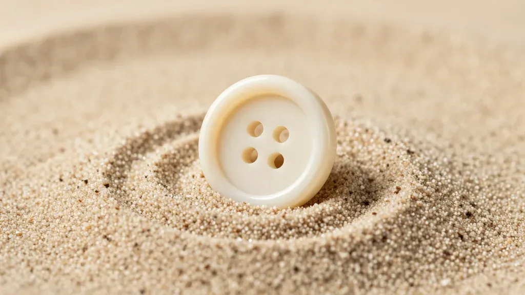 A smooth, glossy white button with four holes lies on fine beige sand, illuminated by soft, diffused light that creates gentle highlights on the button and sand, emphasizing the texture and depth of the composition.