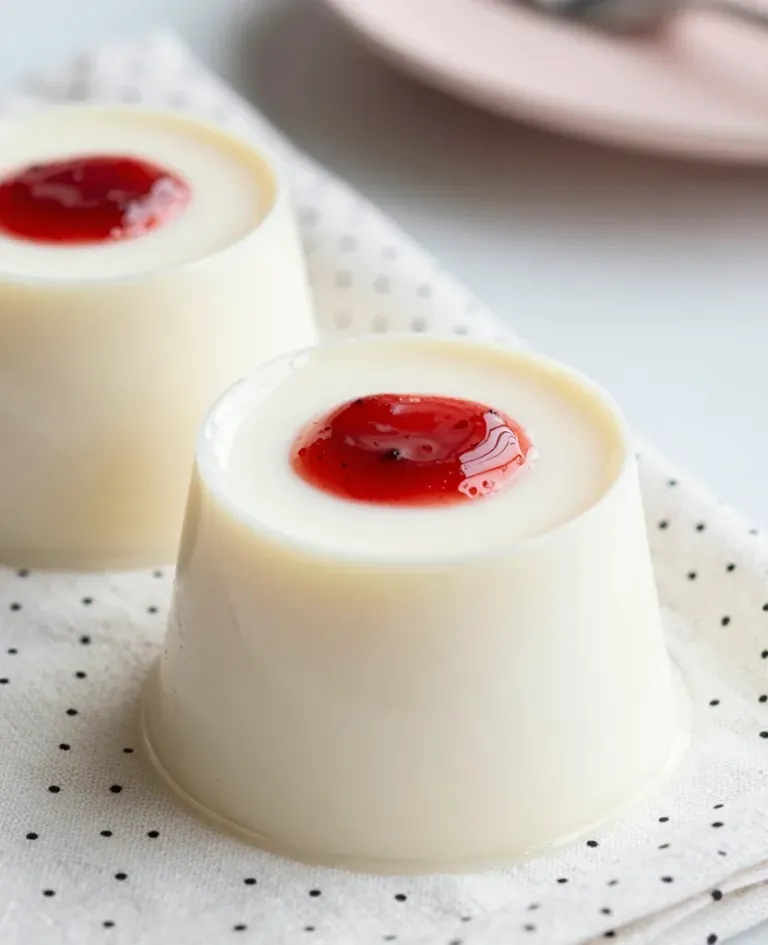 Smooth, creamy panna cotta cups topped with glossy red sauce, captured in soft, diffused light that highlights their texture and creates a shallow depth of field, emphasizing the elegant dessert presentation.