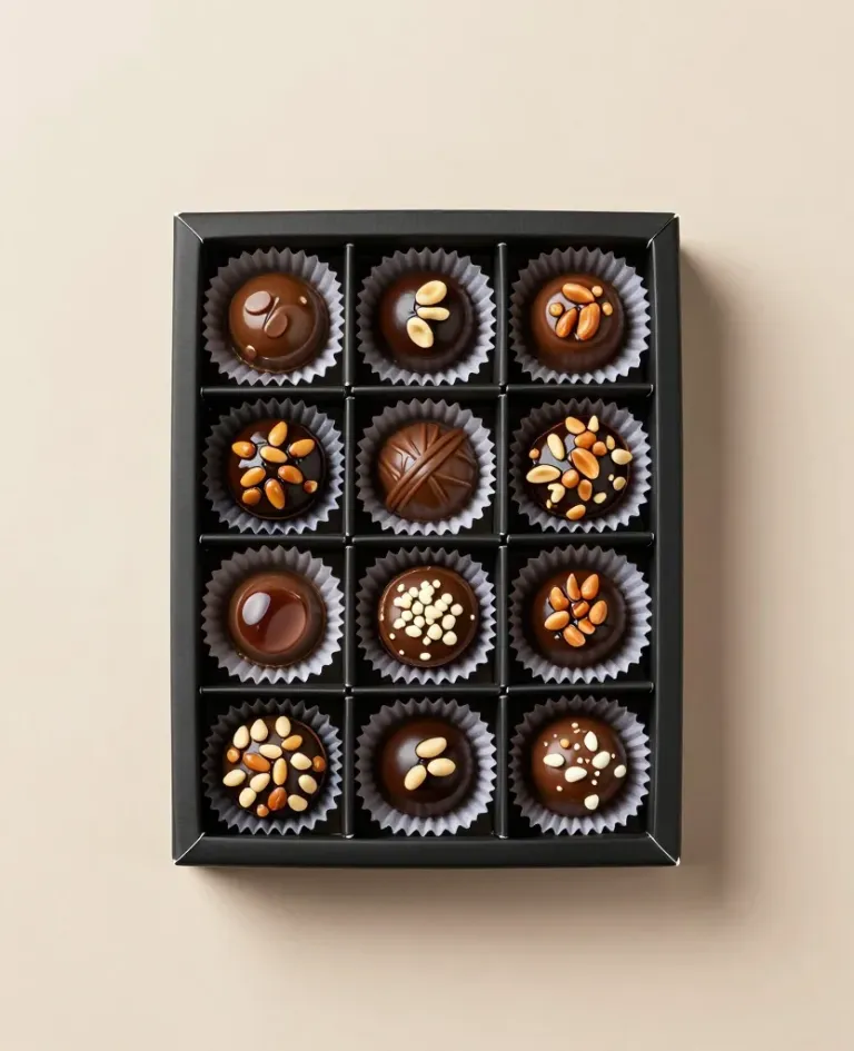 A grid of glossy chocolate bonbons with crunchy toppings, softly lit to highlight their smooth surfaces and create subtle shadows, set against a neutral beige background that emphasizes the chocolates as the main subject.