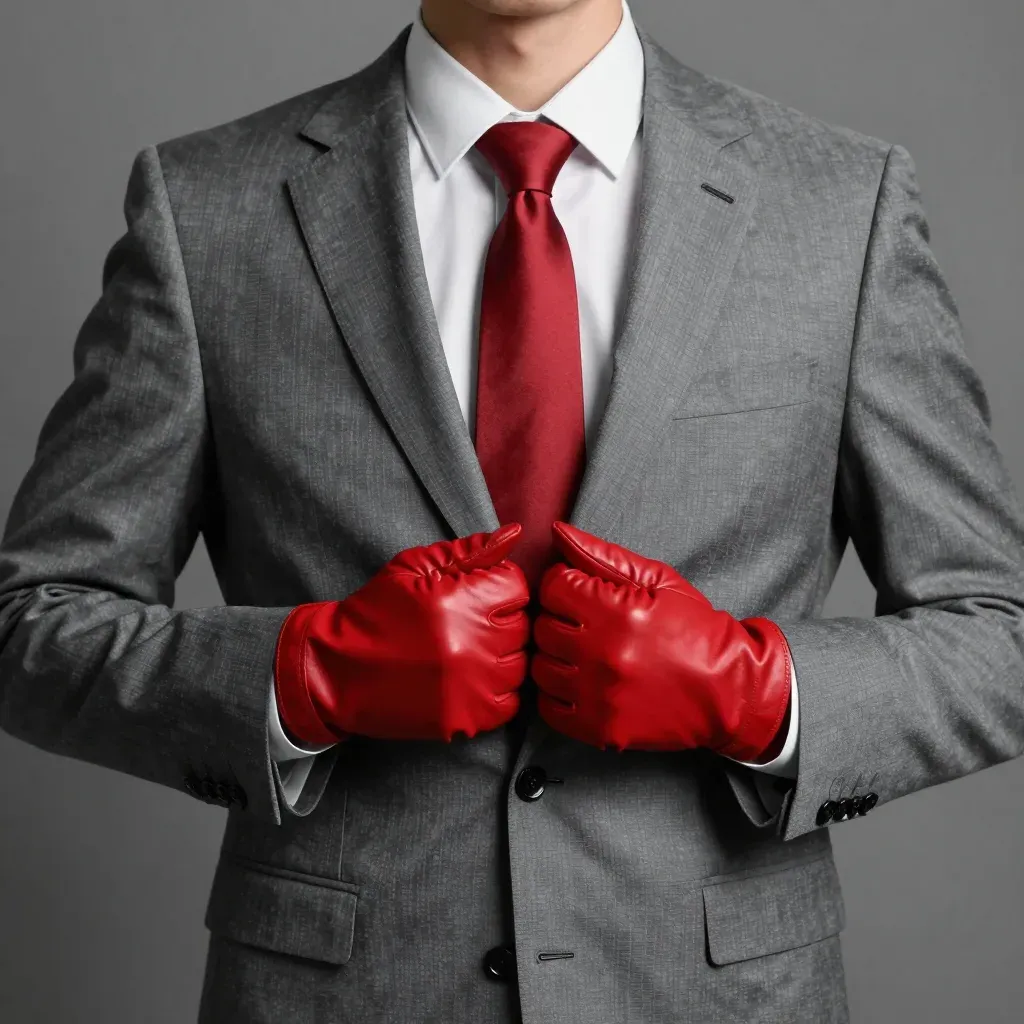 A man in a gray suit grips a glossy red tie with smooth red leather gloves, illuminated by soft, even lighting that highlights the textures and sheen. The neutral gray background ensures the subject remains the focal point.