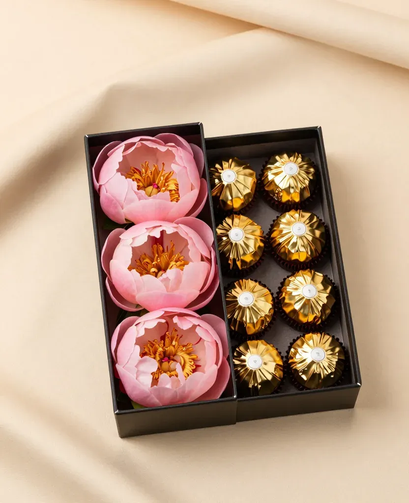 A glossy black box containing soft pink peonies and shiny golden chocolates, softly lit to highlight their textures and reflective surfaces. The symmetrical arrangement and blurred beige background emphasize the box's contents, providing ample copy space.