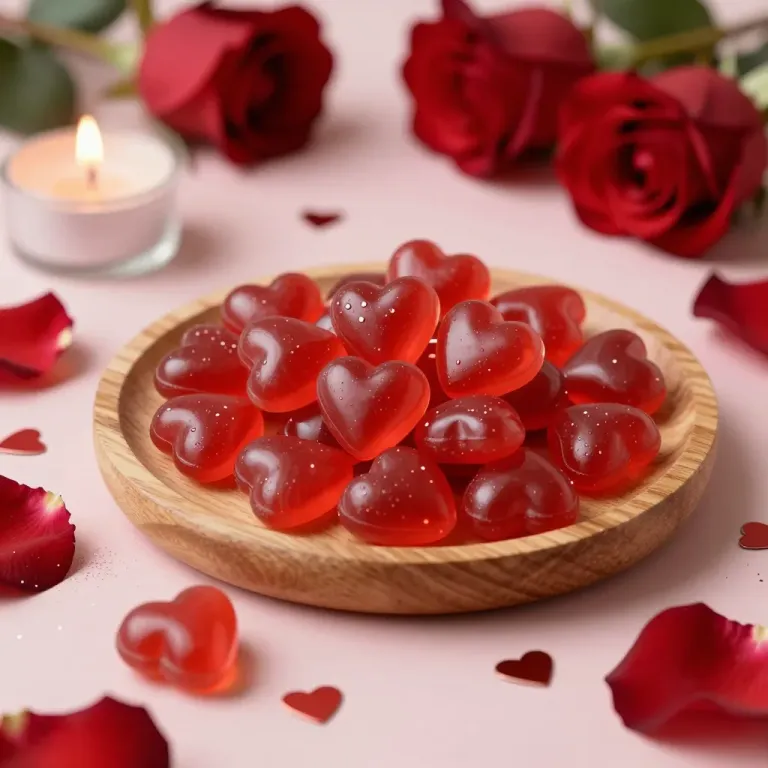 Glossy translucent red heart candies rest in a smooth wooden bowl, surrounded by velvety rose petals and a flickering candle flame, creating a warm, romantic ambiance. Soft directional lighting from the left highlights the candies' surfaces, while shallow depth of field and scattered framing emphasize the central subject against a blush-pink background.