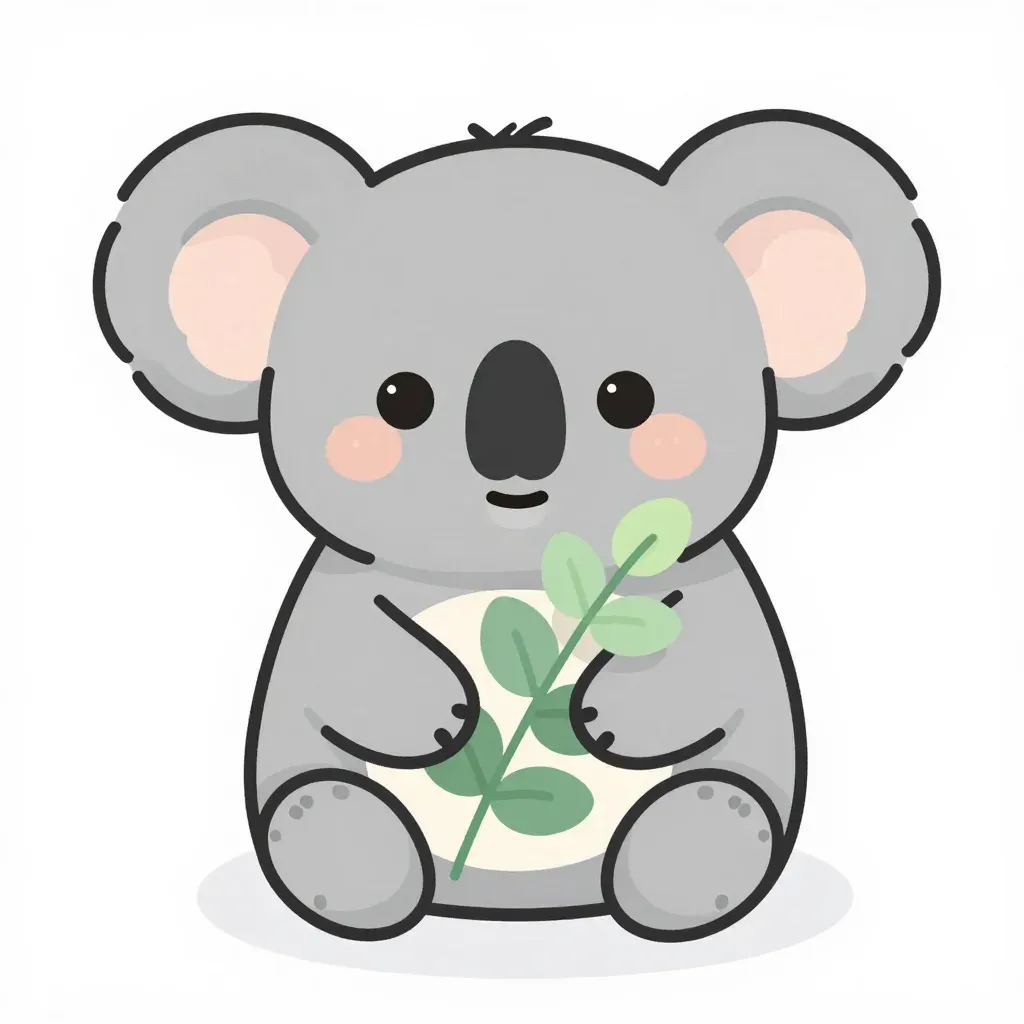 A cute koala holds glossy green leaves, its soft, fuzzy fur and pink ears highlighted by diffused light. The minimal white background ensures the focus remains on the subject, offering ample copy space for design integration.