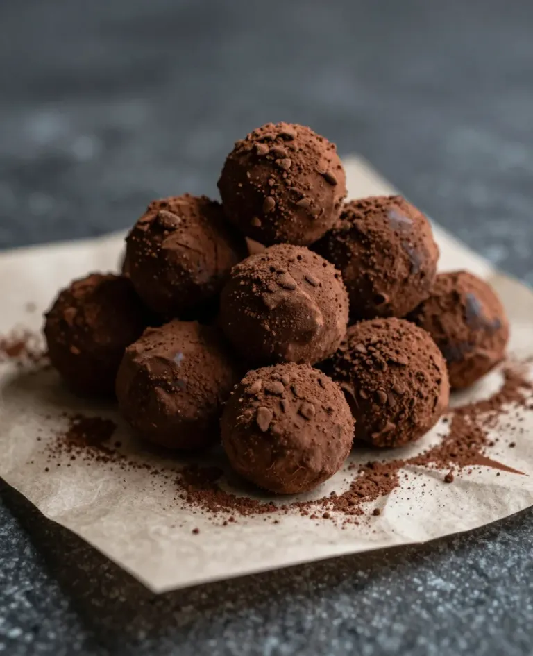 A centered pile of chocolate truffles with a smooth, glossy coating and a soft, creamy interior, set against a dark, textured background with soft, diffused lighting creating gentle highlights and shadows. The composition is slightly off-center on the parchment paper, emphasizing the truffles with a shallow depth of field.