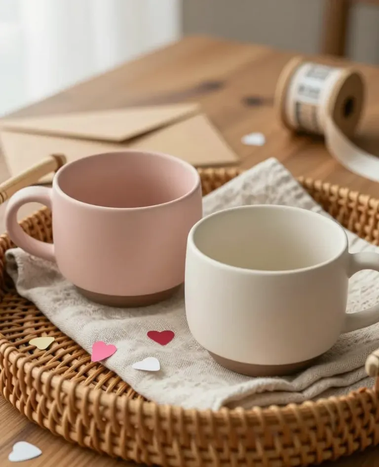 Two matte ceramic tea cups, one blush pink and one creamy off-white, rest on a woven rattan tray lined with a soft linen napkin, surrounded by scattered paper hearts. Soft natural light from the left creates gentle highlights and subtle shadows, with a shallow depth of field emphasizing the cups against a blurred wooden tabletop background featuring craft elements.