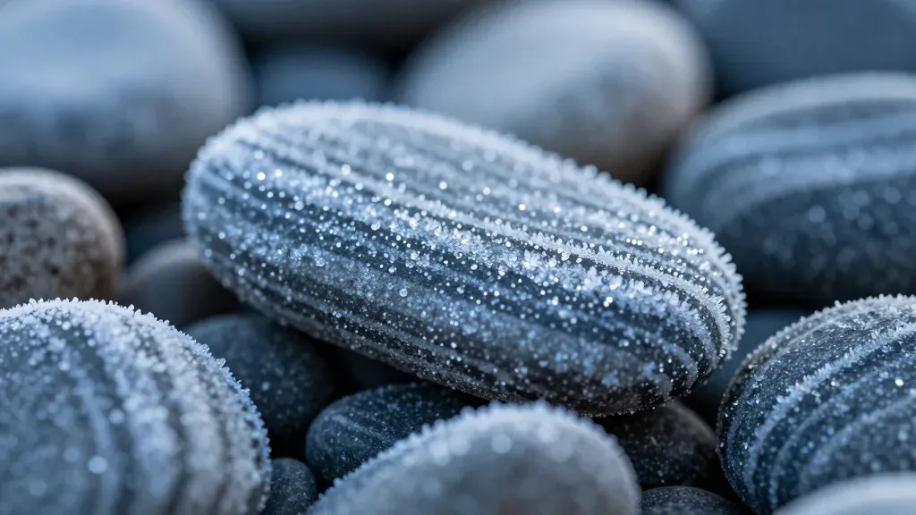 Rough pebbles are delicately covered in crystalline frost, illuminated by soft, diffused light from a winter morning, creating a serene and ethereal glow. The shallow depth of field blurs the background, focusing attention on the intricate textures and cool tones of the frost and pebbles.