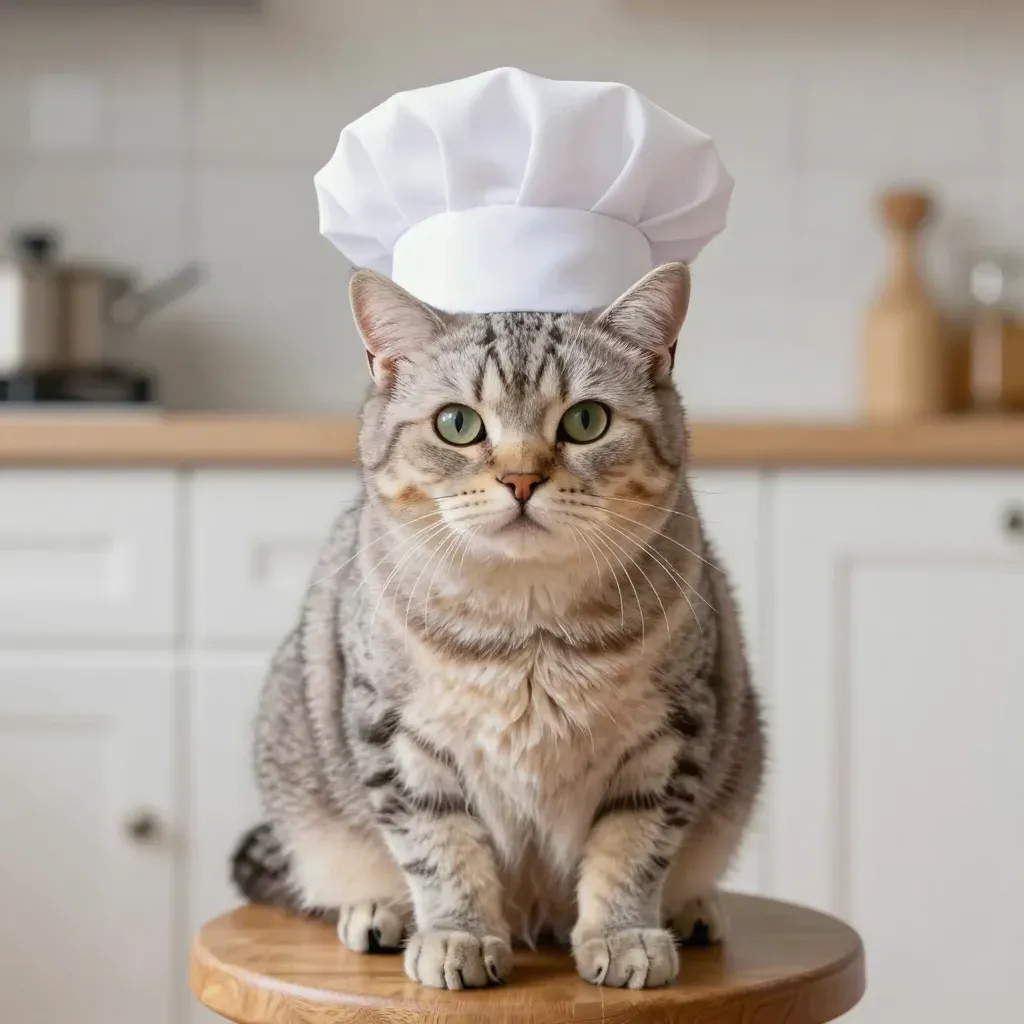 A tabby cat with glossy green eyes and soft, fluffy fur wears a white chef's hat, sitting on a wooden stool in a clean, modern kitchen with white cabinets and wooden accents. The soft, diffused lighting highlights the cat's features and the chef's hat, creating gentle shadows and a dynamic focal point.