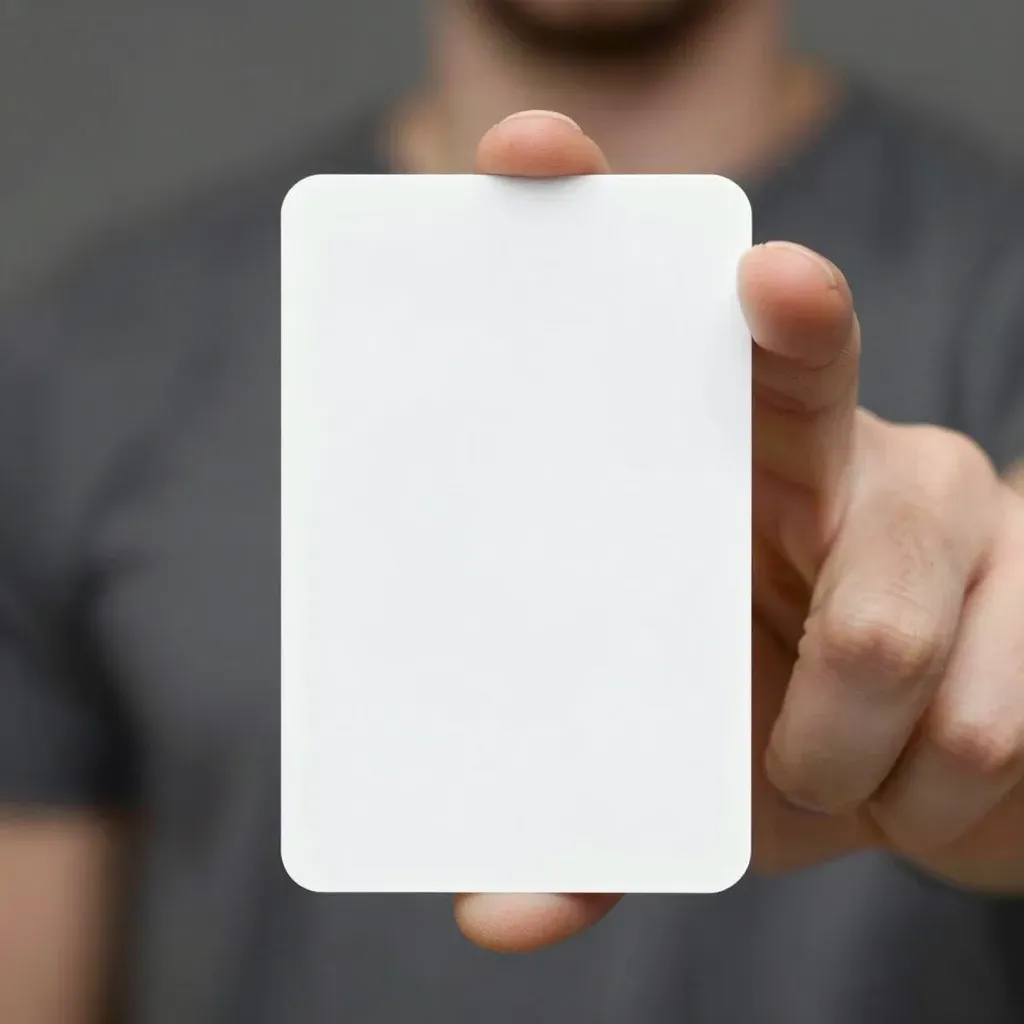 A hand gently holds a smooth, glossy white card against a soft, diffused light background, creating a clean and minimalist aesthetic. The shallow depth of field isolates the hand and card, emphasizing their textures and the subtle interplay of light and shadow.