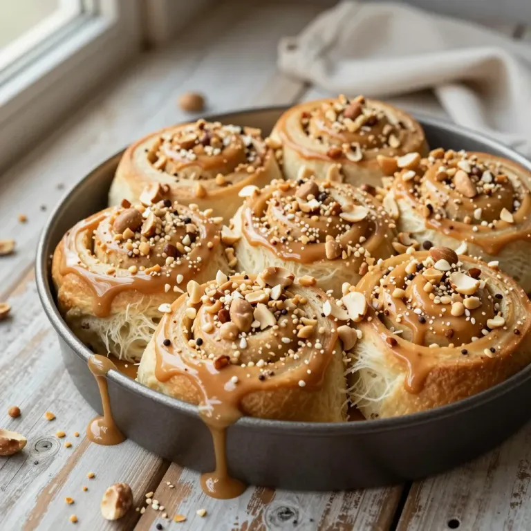 Soft, fluffy peanut butter rolls topped with caramel sauce, crunchy peanuts, and sesame seeds, bathed in warm, soft light that creates a cozy and inviting atmosphere. The shallow depth of field focuses on the rolls, enhancing their texture and making them the centerpiece of the image.