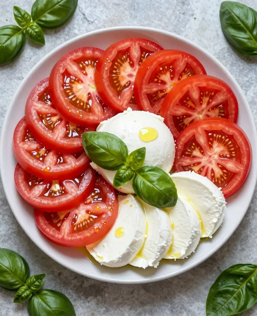 Sliced tomatoes, fresh mozzarella, and basil leaves are arranged in a circular pattern on a white plate, showcasing glossy, juicy tomatoes and creamy, oil-dotted cheese. Soft, diffused natural light from above enhances textures with gentle highlights and subtle shadows, while a shallow depth of field keeps focus on the plate against a softly blurred grey stone background.
