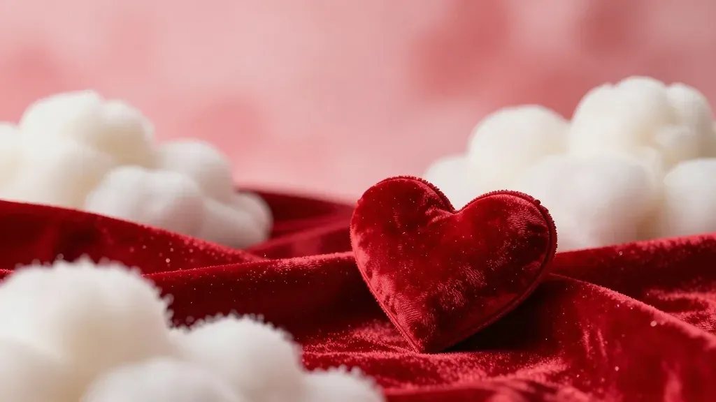 A soft, glossy red velvet heart is nestled among fluffy white clouds, creating a dreamy, romantic scene. The diffused lighting highlights the textures and depth, making the image ideal for Valentine's Day or wedding themes.