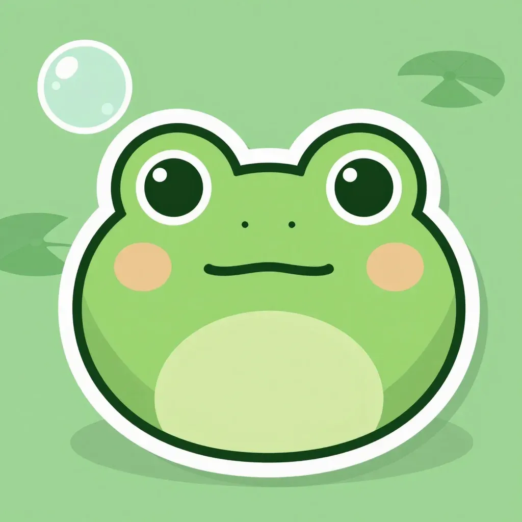 A frog with large, glossy eyes and a slightly melancholic expression is centered in the image, set against a soft, diffused light that highlights its features and creates gentle shadows. The background, featuring subtle water lily leaves and a single bubble, enhances the peaceful pond setting.