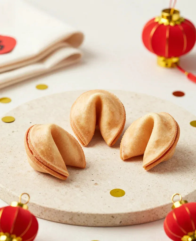 Three golden fortune cookies are neatly arranged on a textured surface, highlighting their crisp, flaky texture and slight sheen under soft, diffused lighting. The shallow depth of field and festive background with red and gold decorations emphasize the cookies, making it ideal for holiday-themed content.
