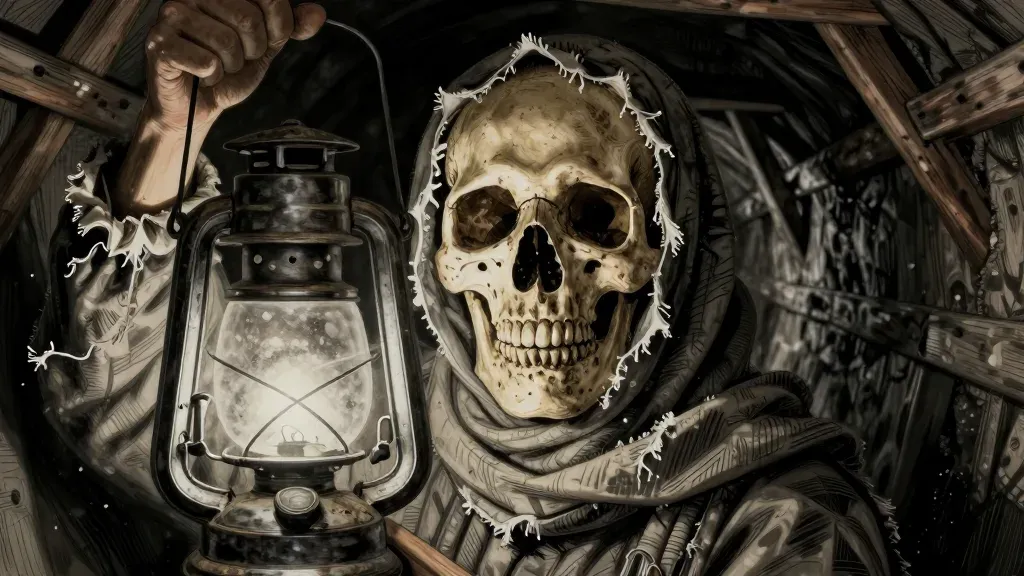 A human skull clad in a frayed, hooded garment grips a tarnished brass kerosene lantern, its cracked glass casting a warm glow on the bone’s forehead and teeth. The low-key, directional lighting creates deep shadows in the eye sockets and background, with a cluttered, dimly lit mine tunnel framing the subject.