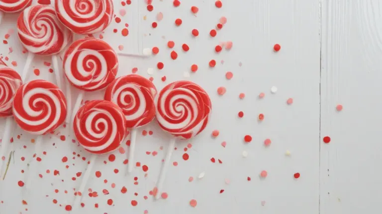 A top-down view of red and white lollipops with spiral patterns, scattered with confetti, set against a clean white wooden surface. Soft, diffused light highlights the glossy texture and creates gentle shadows, emphasizing the vibrant colors and playful composition.