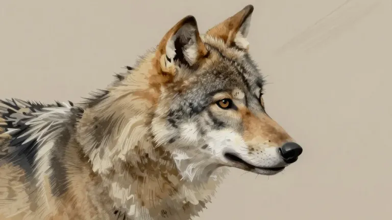 A close-up of a wolf pup in profile, showcasing its fluffy, detailed fur and warm, diffused lighting that highlights the texture. The shallow depth of field and neutral background emphasize the subject, making it ideal for use in wildlife or nature-themed designs.