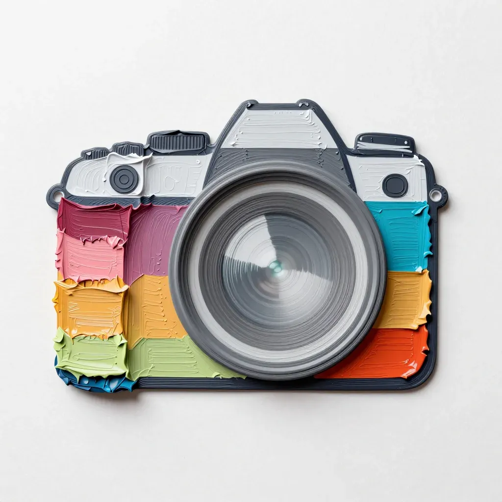 A camera is depicted in an abstract style with thick, glossy paint, creating a three-dimensional effect. Soft, diffused lighting enhances the vibrant colors and textures, making the camera stand out against a neutral background.