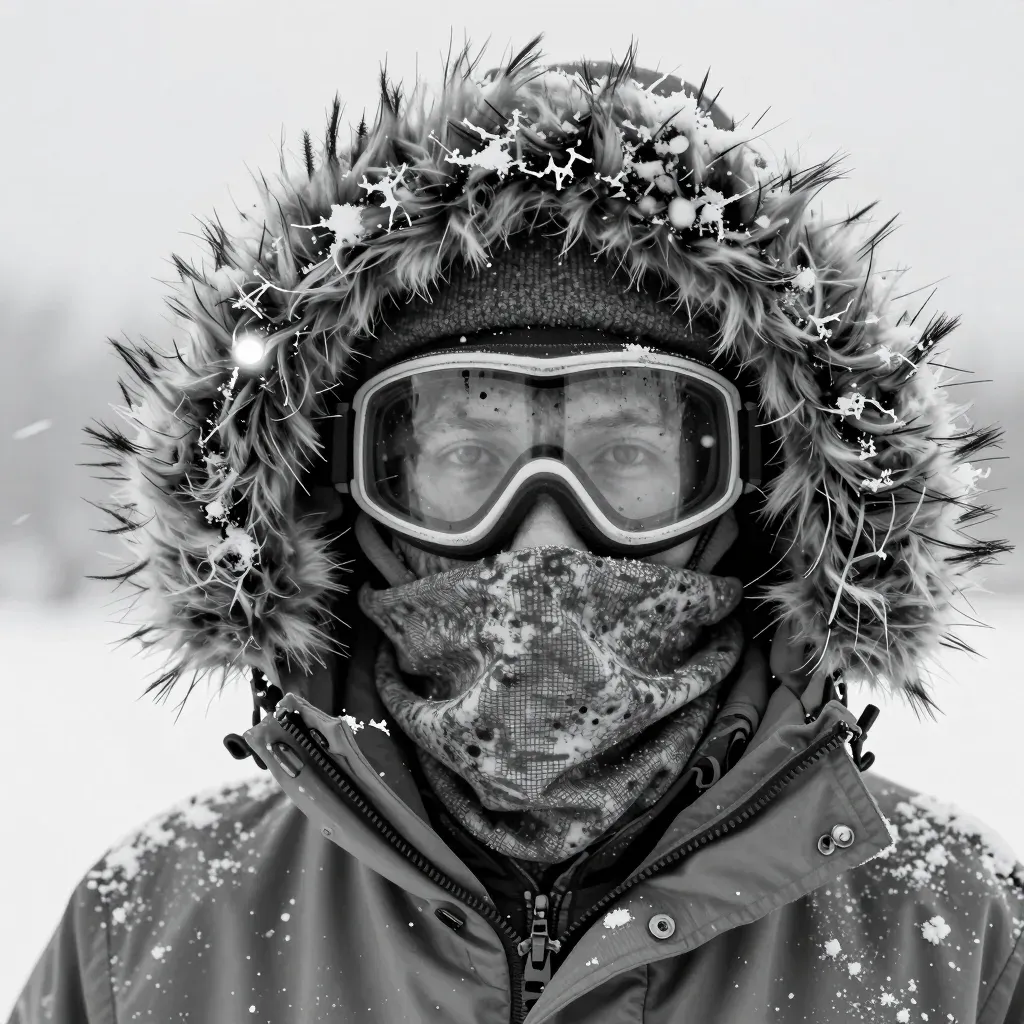 A close-up portrait of a person in winter gear, their face obscured by frosty goggles and a patterned balaclava, framed by a snow-laden fur hood with decorative elements. Diffused overcast lighting creates soft highlights on the glossy goggles and snowflakes, with a shallow depth of field blurring the snowy background into an indistinct white expanse.