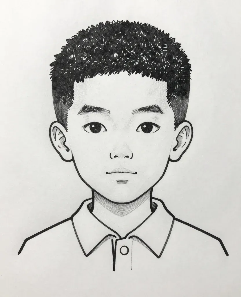A young boy with short, spiky, textured hair and smooth, slightly glossy skin is depicted in a close-up portrait with soft, diffused lighting that creates gentle shadows and highlights. The plain white background, blurred and out of focus, emphasizes the subject and provides ample copy space.