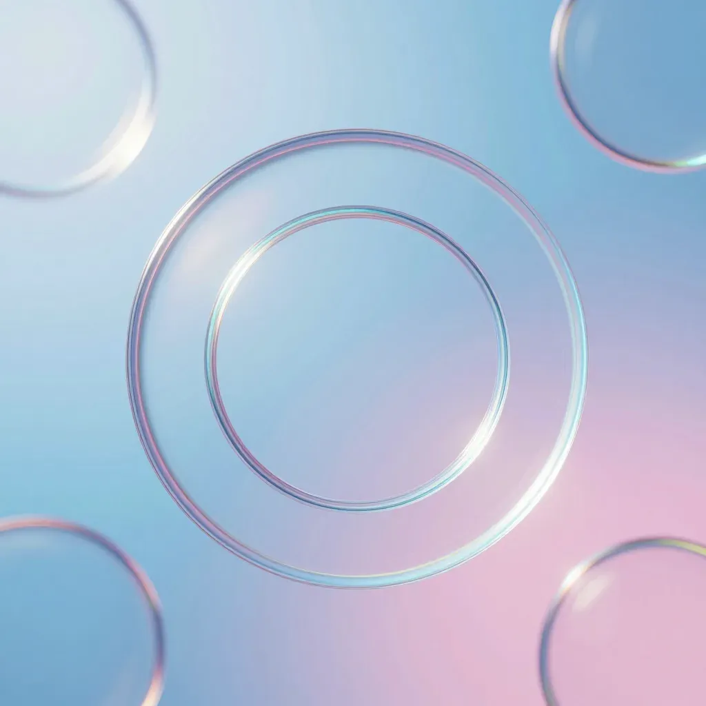 Iridescent water rings shimmer with pastel blues and pinks, softly illuminated from above, creating a dreamy, ethereal effect. The blurred gradient background enhances the sense of depth and focus on the central rings, making it ideal for modern, abstract designs.