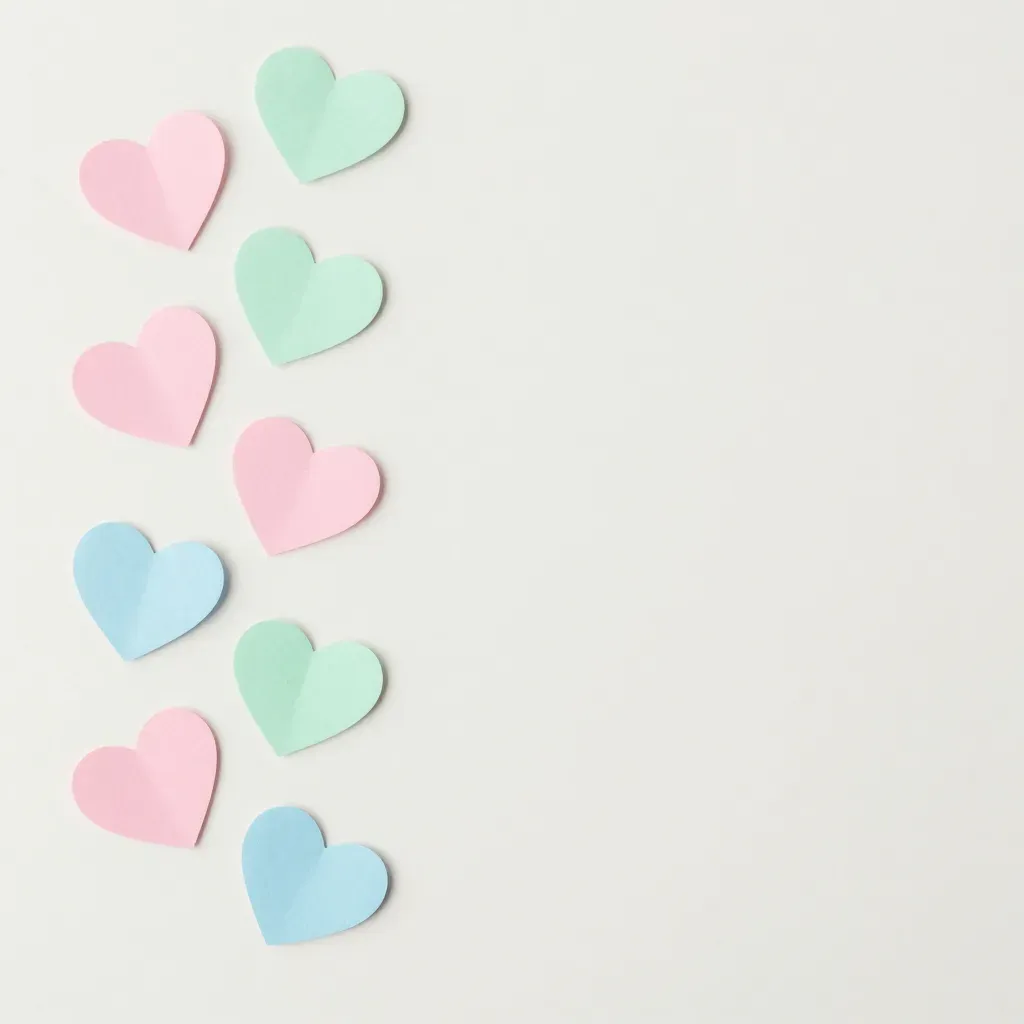 Glossy pastel hearts arranged in a descending line against a soft, diffused light creates a visually balanced and serene composition. The pure white background enhances the vibrant colors and provides ample copy space for various design applications.