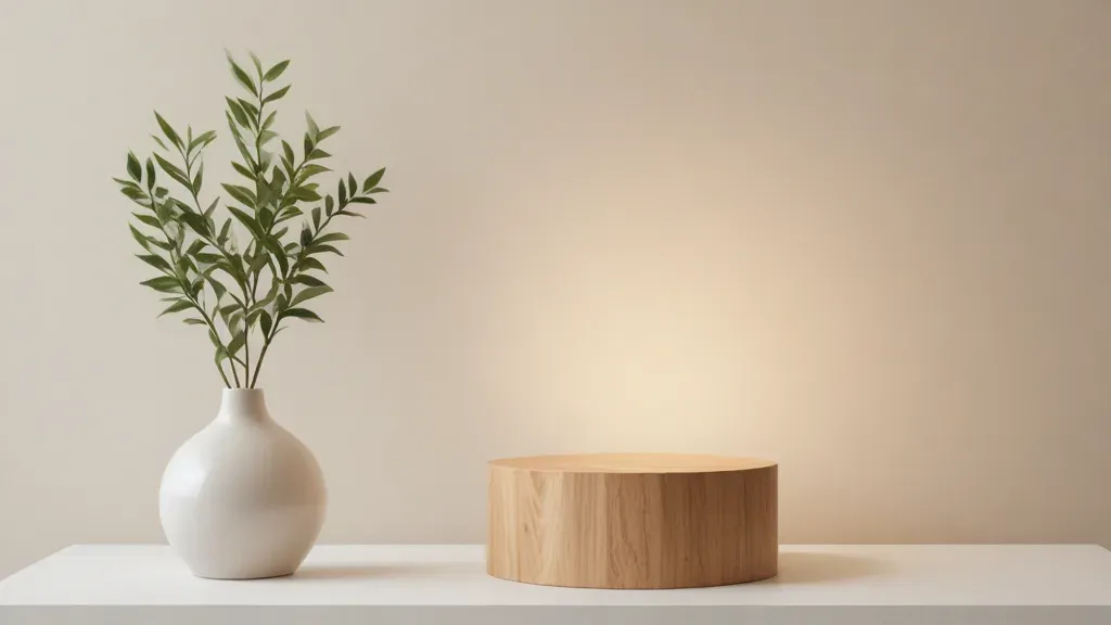 A glossy white ceramic vase with a green plant sits to the left of a natural wood sculpture, creating a balanced and serene composition with soft, diffused lighting and a neutral beige background.