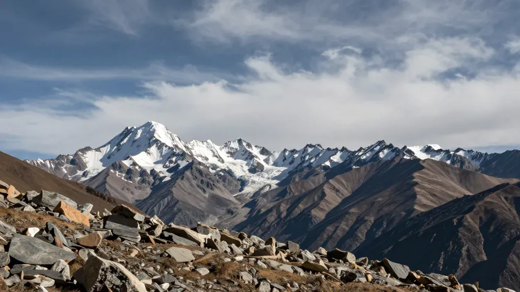 Rugged snow-capped mountain peaks stand against a backdrop of a clear sky with scattered clouds, bathed in the soft, diffused light of the late afternoon sun. The foreground features a foreground of rough rocks, adding depth and texture to the composition.