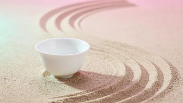 A white ceramic teacup sits centered on raked sand, creating a serene and minimalist composition. Soft, diffused lighting highlights the smooth, glossy surface of the teacup and the textured sand, enhancing the tranquil atmosphere.