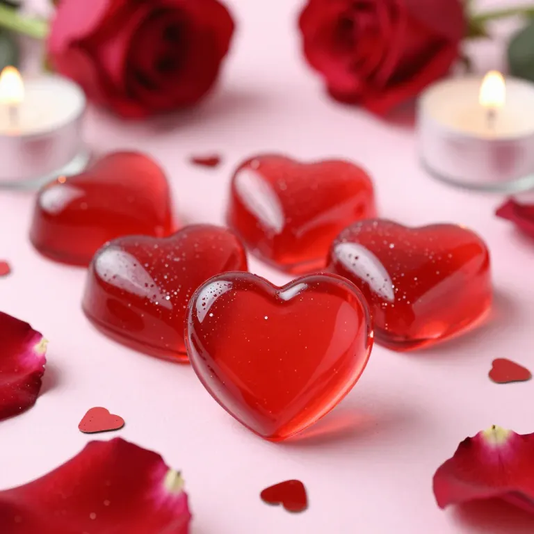 Translucent jelly heart cubes shimmer under soft, diffused candlelight, creating a romantic and intimate atmosphere. The shallow depth of field blurs the background, emphasizing the glossy texture and rich red hue of the jelly cubes.