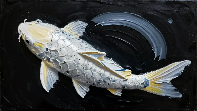 A close-up of a glossy koi fish with black spots, its scales reflecting light, creating a shimmering effect. The soft, diffused lighting highlights the fish's fluid form and the swirling water around it, emphasizing its graceful movement against a deep black background.