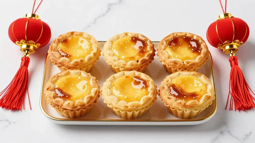 Golden pastry cups with glossy caramelized filling are arranged symmetrically on a tray, softly lit to highlight their textures and create gentle shadows. The red lanterns in the background add a festive touch, slightly blurred to emphasize the subject.