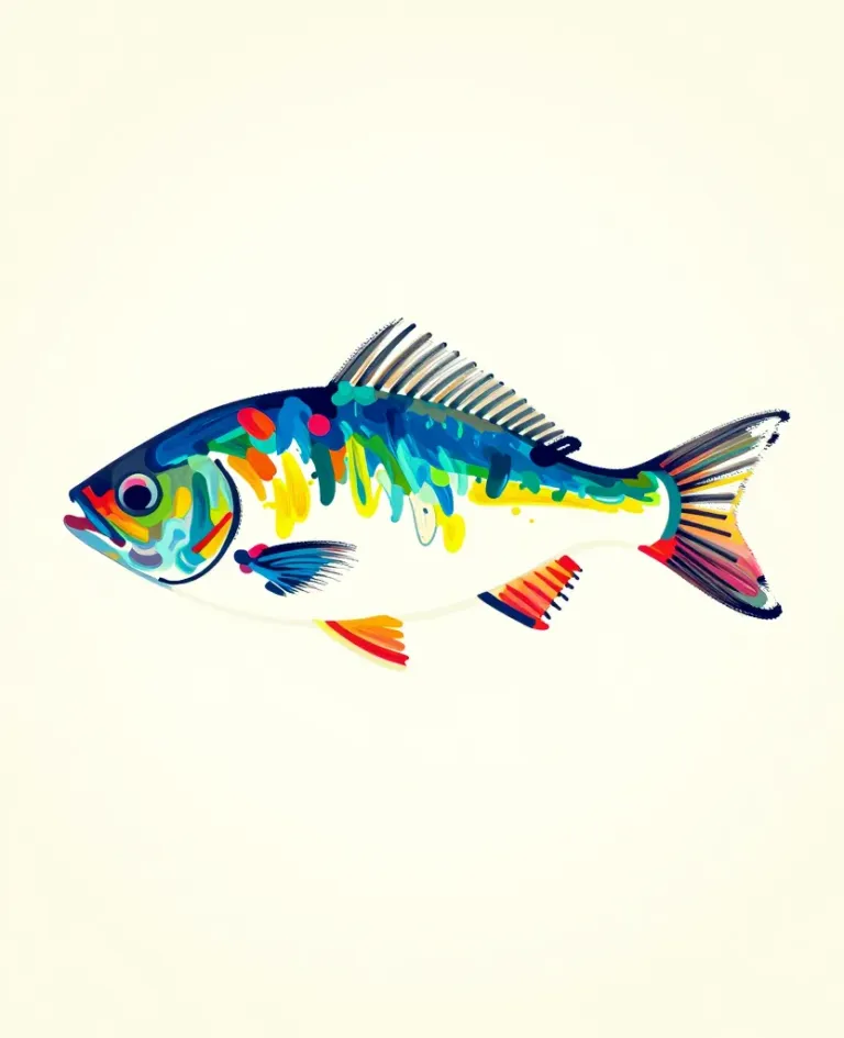 A vibrant, glossy fish silhouette with dynamic paint strokes, illuminated by soft, directional light from above, creating depth and dimension. The neutral, plain background ensures the subject stands out, making it ideal for graphic design and branding applications.