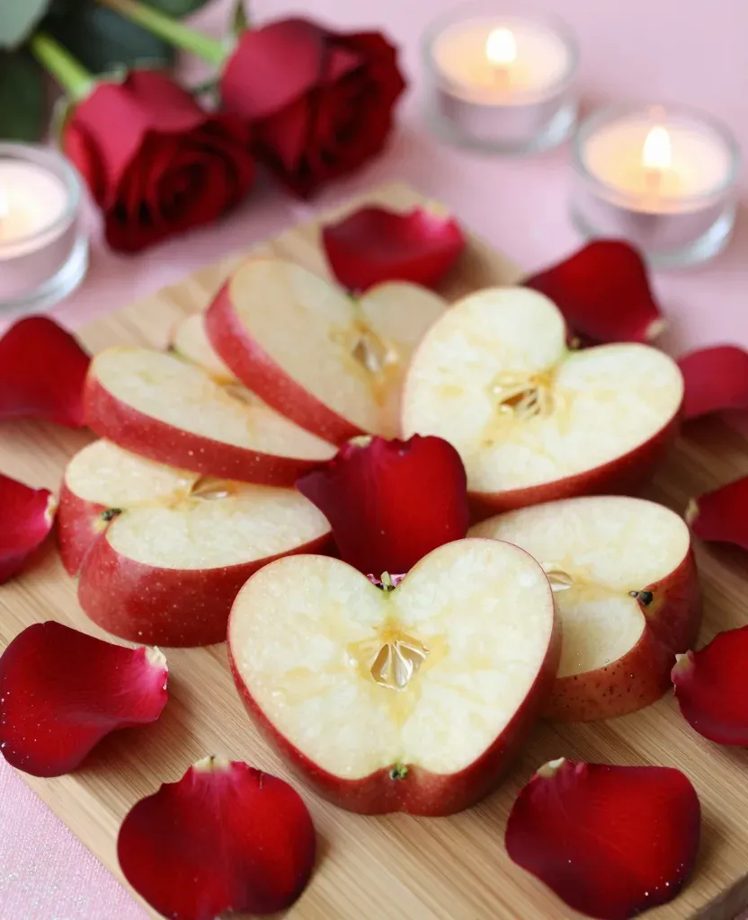 Crisp, moist apple hearts and velvety red rose petals are arranged on a natural wood board, illuminated by soft warm light and flickering candle glow. The shallow depth of field emphasizes the central composition with a softly blurred pink background, creating an intimate, romantic atmosphere.