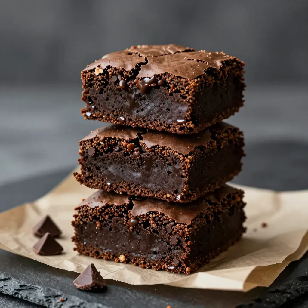 A pyramid stack of glossy chocolate brownies with a crumbly interior, softly lit from above, creating subtle highlights and shadows, set against a blurred dark gray background that enhances the brownies' rich color and texture.