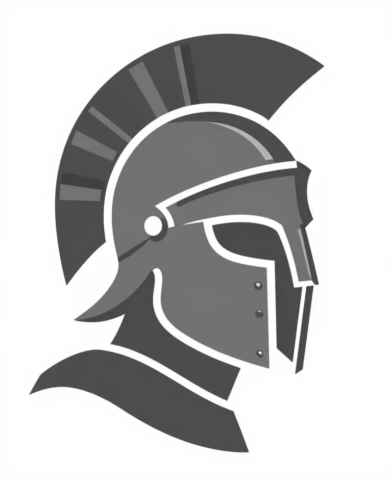 A glossy black Roman gladiator helmet in a side profile, illuminated by directional light that creates strong shadows and highlights, emphasizing the visor and texture. The plain white background with a blurred effect enhances the helmet's prominence and provides ample copy space for design integration.