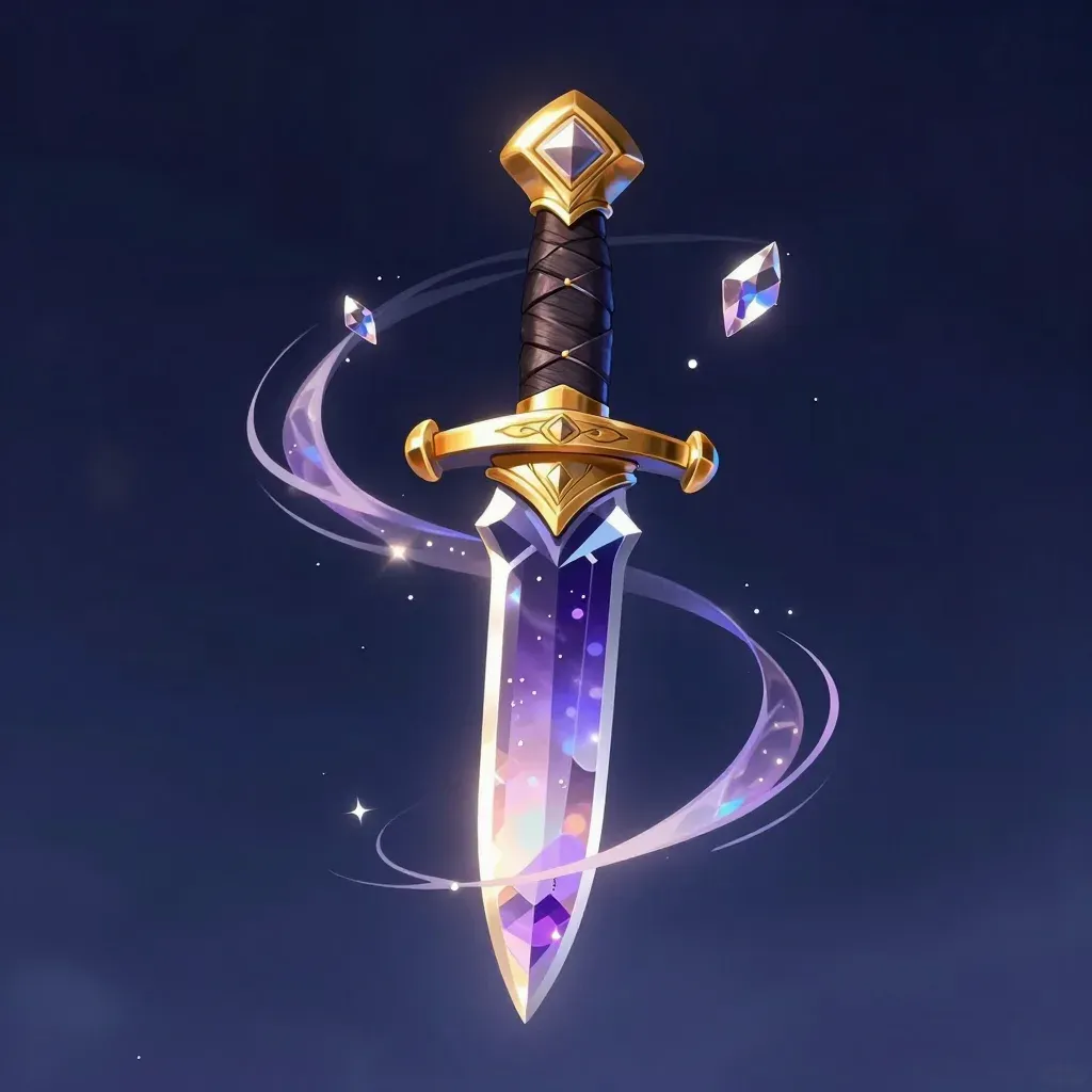 A radiant arcane crystal dagger with a glossy dark handle and reflective polished blade, spotlighted against a starry, blurred background, creating a dramatic and ethereal effect. The composition is centered, emphasizing the dagger's intricate details and the interplay of light and shadow.