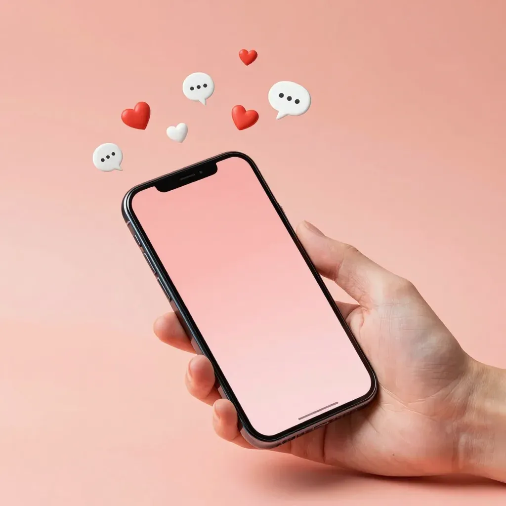 A hand holds a glossy black smartphone against a soft peach background, with floating heart and speech bubble emojis. The diffused lighting highlights the smooth texture of the phone and creates a warm, inviting atmosphere.
