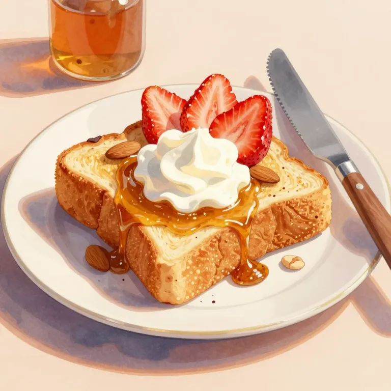 A crispy golden toast slice is topped with glossy honey, fluffy whipped cream, juicy strawberries, and crunchy almonds, all set against a soft, warm, and diffused light that highlights the textures and creates gentle shadows. The simple, light-colored table background with a blurred glass of amber liquid keeps the focus on the toast, creating a balanced and inviting composition.