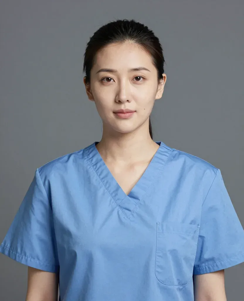 A serene nurse in light blue scrubs stands upright, bathed in soft, diffused light that creates gentle shadows across her face and attire. The neutral gray background, blurred and out of focus, emphasizes the subject and provides a clean, professional backdrop.