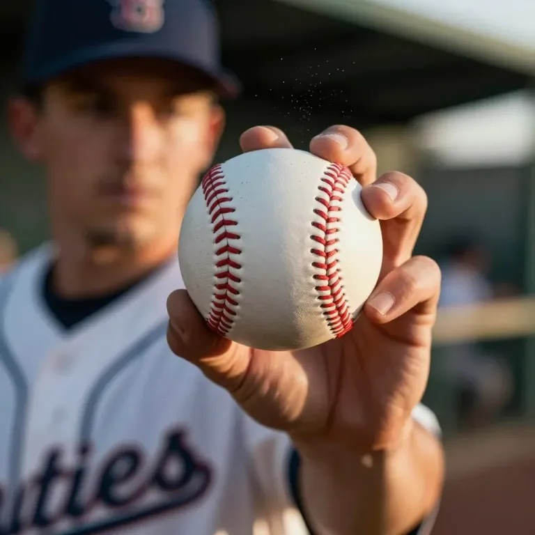 A baseball held in a pitcher's hand is captured mid-release, showcasing smooth yet worn leather, raised red stitching, and natural skin texture with a slight sheen, all illuminated by bright sunlight. The shallow depth of field isolates the ball and hand against a blurred dugout background, emphasizing the subject with strong rim lighting and a low-angle perspective.