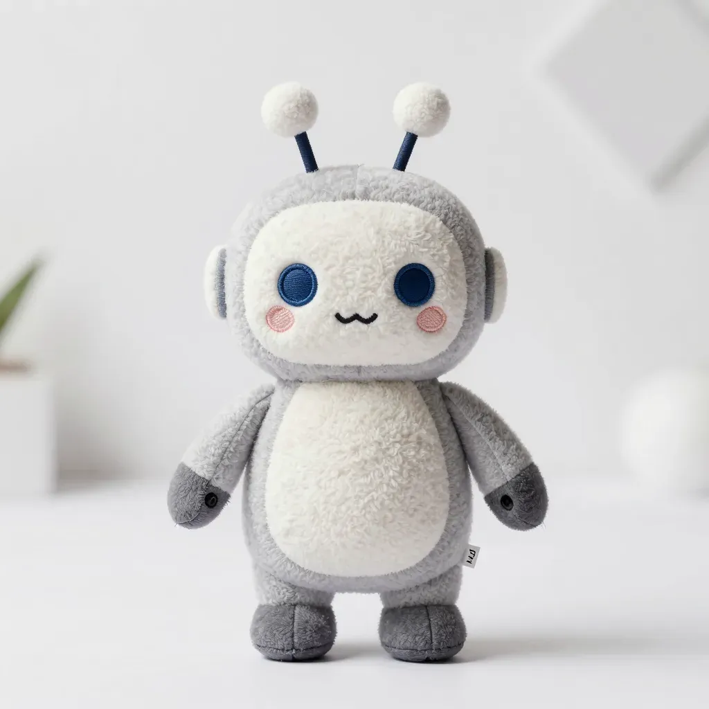 A soft, plush robot toy with a slightly fuzzy texture and blue eyes and pink cheeks, set against a clean, white background with diffused lighting and a shallow depth of field. The toy is the focal point, with the background softly blurred to emphasize its features and create a clean, minimalist aesthetic.