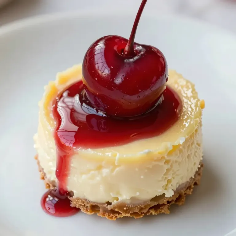 A close-up of a mini cheesecake with a graham cracker crust, crowned with a whole cherry and dripping cherry sauce, showcasing smooth, dense texture and glossy sheen. Soft diffused lighting highlights the cherry and sauce, with shallow depth of field isolating the dessert against a clean white plate background.