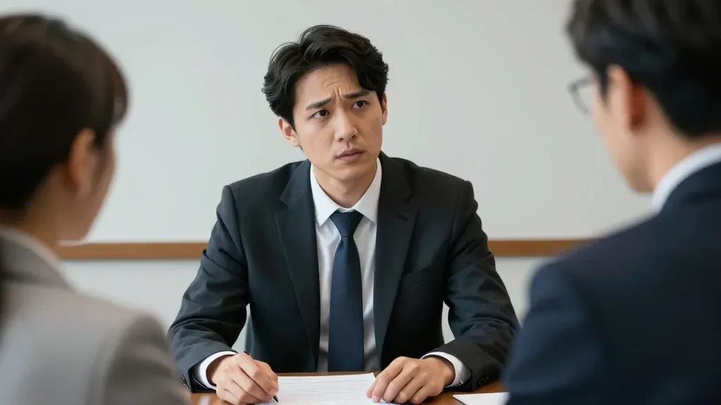 A man in a suit is intently taking notes at a polished wooden table, with soft, even lighting creating gentle shadows. The neutral color palette and shallow depth of field suggest a professional setting with other individuals present in the background.