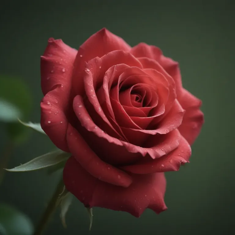 A close-up of a fully bloomed red rose with soft, velvety petals and a glossy sheen from dew, illuminated by diffused light from above, creating gentle highlights and shadows. The blurred green background provides a natural and unobtrusive backdrop, offering ample copy space.